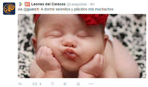 | Tweet de un fanático de un equipo de béisbol local de Venezuela que expresa la sensación de placer luego de una victoria sobre su “archienemigo”. |